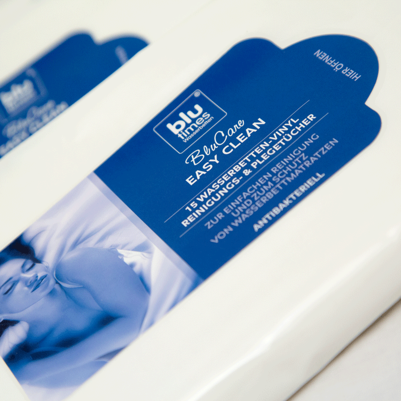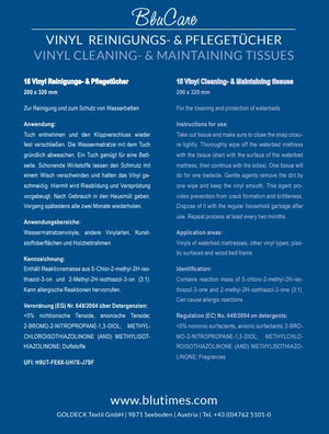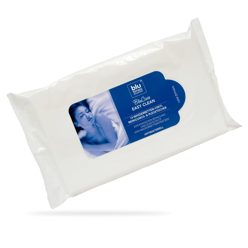 Eine Packung Pflegetücher BluCare EasyClean beinhalten 15 Wasserbetten-Vinyl Pflege- und Reinigungstücher. Zur einfachen Reinigung und zum Entfernen von Schutz für Wasserbettmatratzen. Geeignet für Wasserbettmatratzenvinyl, andere Vinylarten und Kunststoffoberflächen.