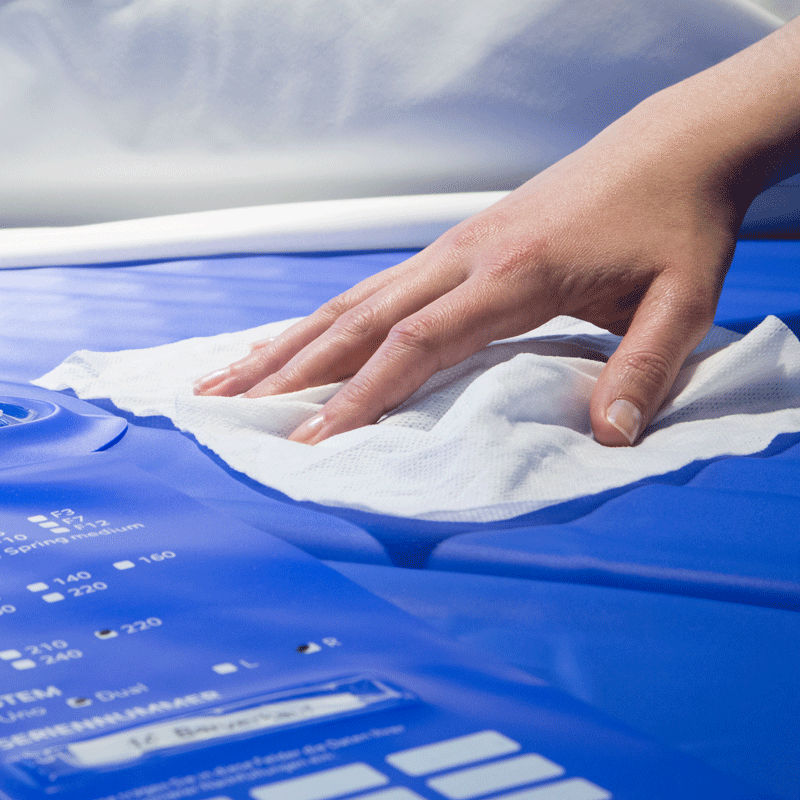 - Die Wassermatratze mit dem Tuch gründlich abwischen und 2 Minuten einwirken lassen.