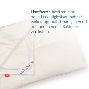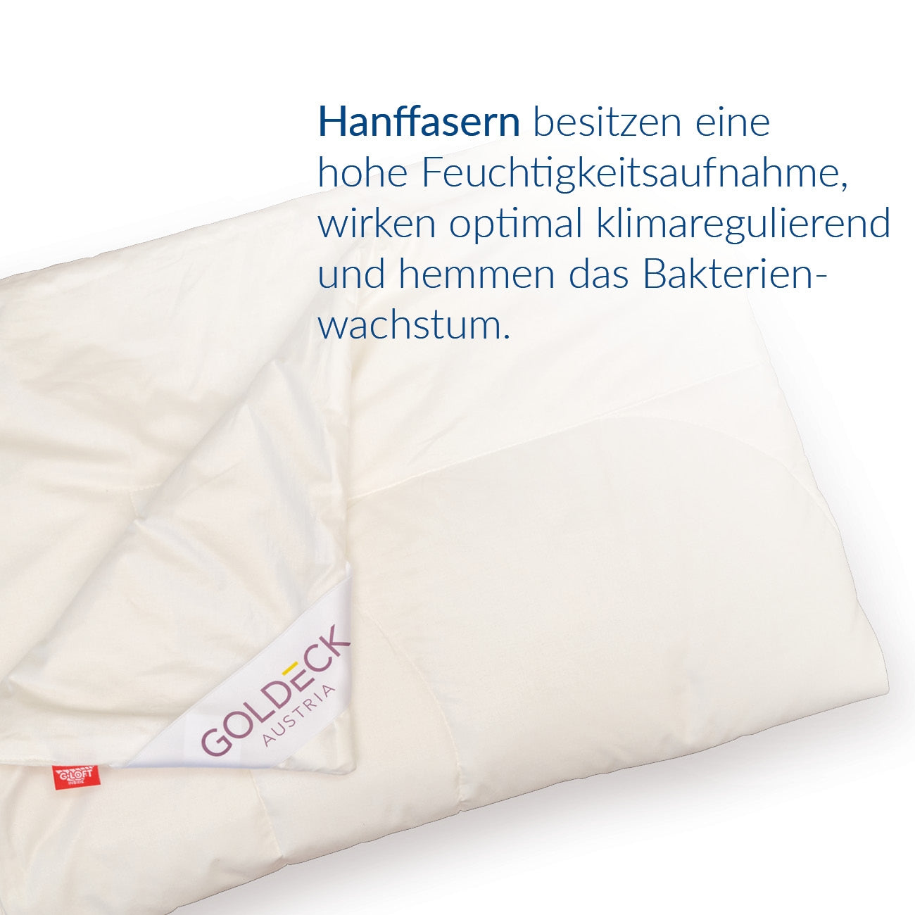 Durch Lufteinschlüsse in den Hanffasern fühlt sich der Hanfstoff im Sommer kühl, im Winter dagegen angenehm und wohlig warm an. Für ein erholsames Schlafgefühl das ganze Jahr.