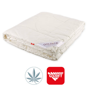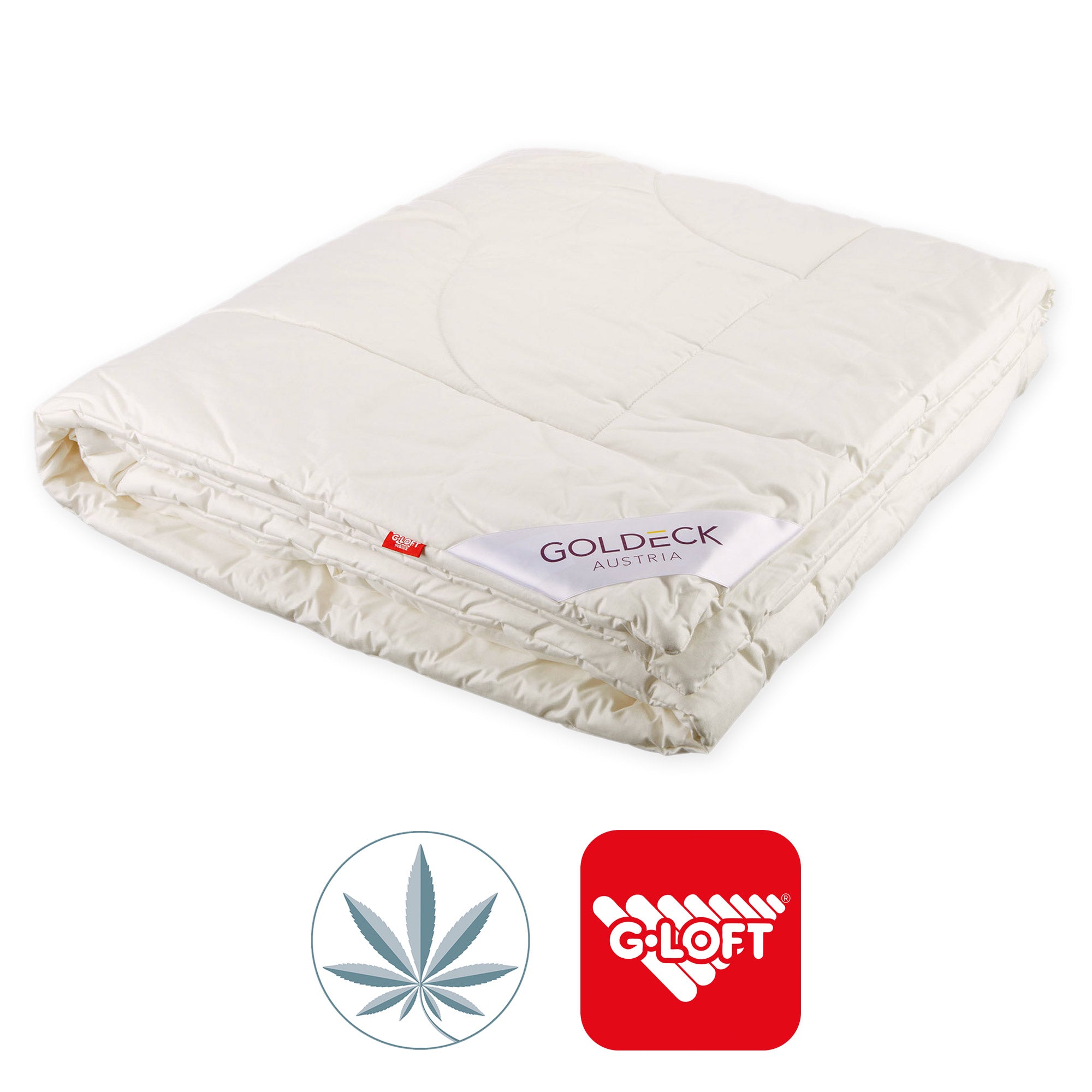 Die HANF AKTIV Ganzjahresbettdecke besteht im Inneren zu 50 % aus umweltfreundlichen Hanffasern und zu 50 % aus G-LOFT® Softvlies. So vereint sie die feuchtigkeitsregulierenden Eigenschaften der ältesten Naturfaser mit den Vorzügen der modernsten Klimahohlfaser.
