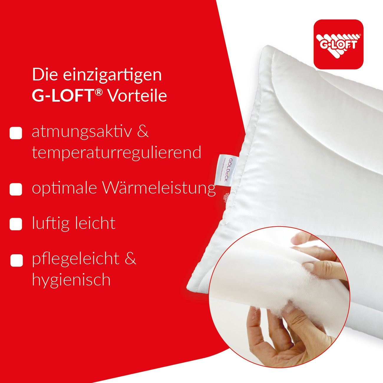 TENCEL™ Fasern, welche aus dem erneuerbaren Rohstoff Holz gewonnen werden, absorbieren Feuchtigkeit besser als Baumwolle. Beim Abgeben der Feuchtigkeit entsteht ein leicht kühlender & klimaregulierender Effekt. In Kombination mit G-LOFT® entsteht so ein bauschiges und weiches Schlaferlebnis.