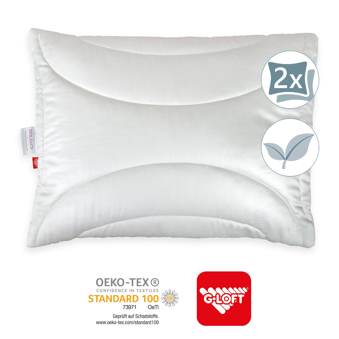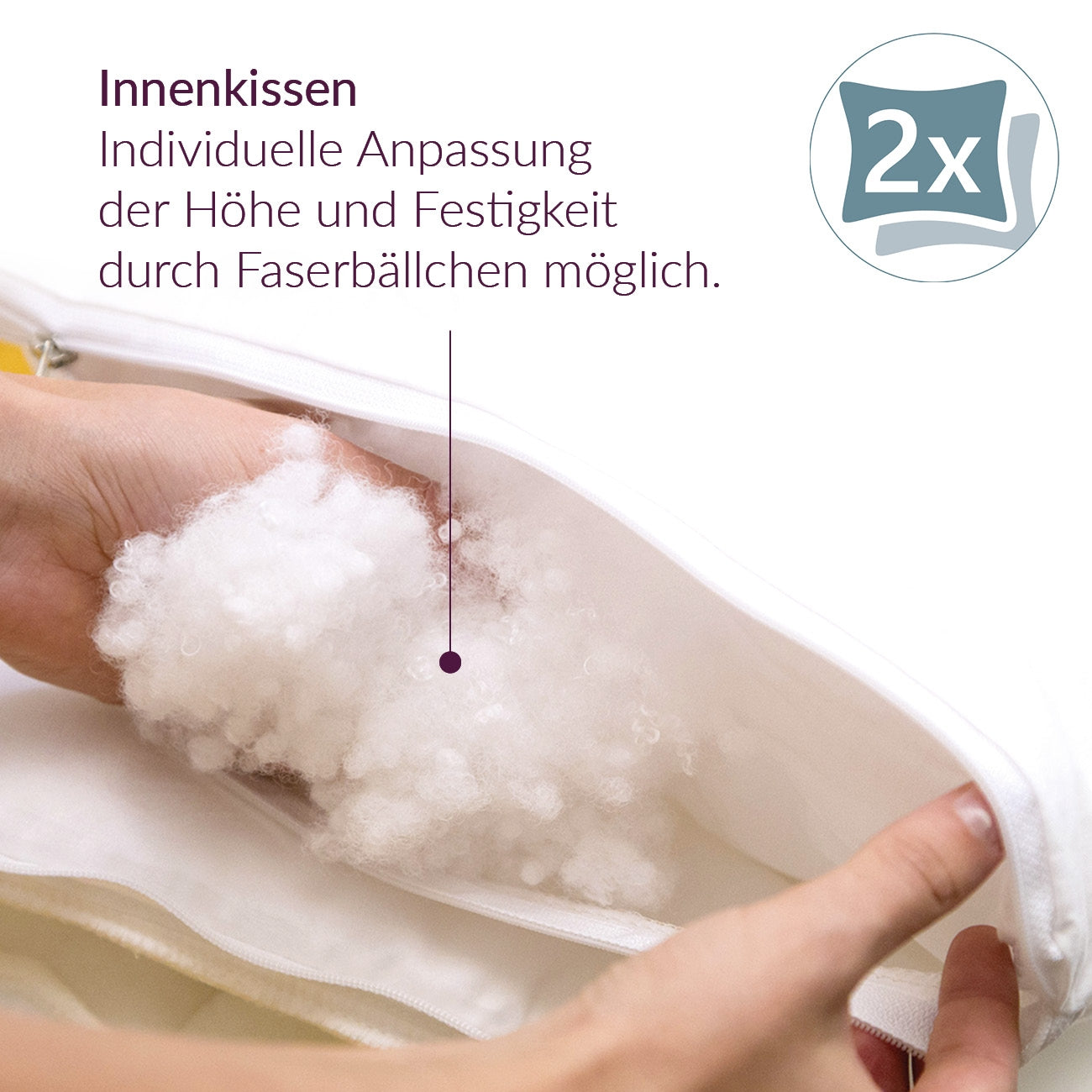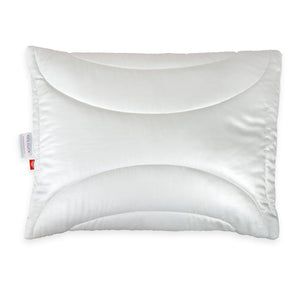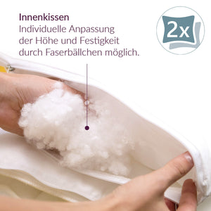 Die Außenhülle kann abgenommen und mit jedem Bettwäsche-Wechsel bei 60°C mitgewaschen werden. Das ebenso waschbare Innenkissen ist mit Klimafaserbällchen gefüllt. Durch Entnahme oder Zugabe dieser Faserbällchen kann das Kissen in der Höhe jederzeit angepasst werden. Das Innenkissen wird in der Regel nicht so häufig gewaschen wie die Außenhülle.